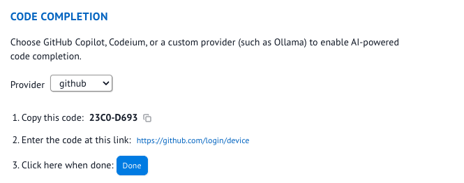 - Ensure you have an LLM provider that offers API access for code completion (either external or running locally)