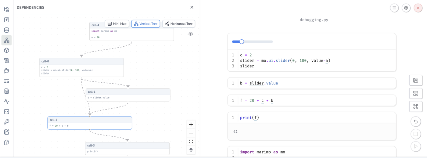 marimo understands the relationships between cells based on the variables they define and reference. When things don't work as expected, marimo provides several tools to help you understand both marimo's interpretation of your notebook and debug issues.
